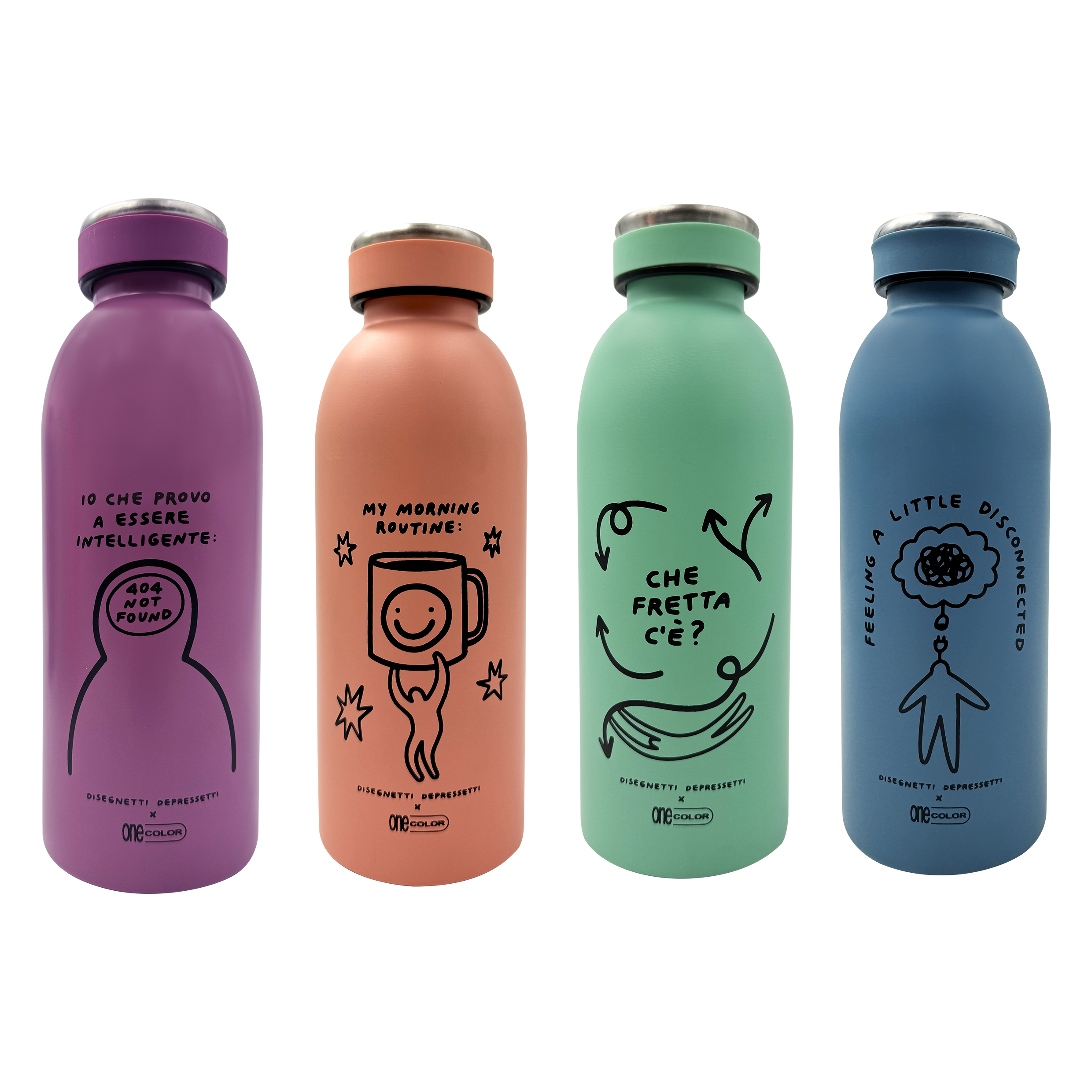 Disponibili in 3 grafiche diverse, le borracce Disegnetti Depressetti sono perfette per chi vuole idratarsi senza rinunciare a un pizzico di ironia!